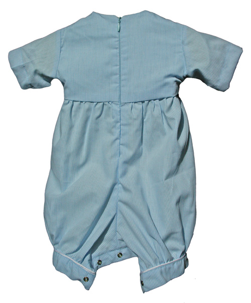 Handsmocked insert to cotton romper. Round neck and Botton up legs for easy nappy changes. Small puppy buttons on yoke for added detail.